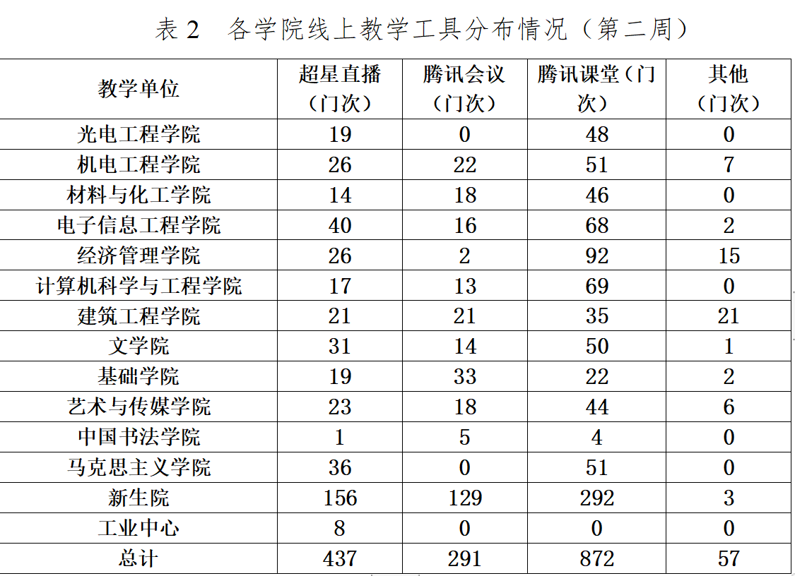 通過前期的問題反饋,教師對線上教學工具進行了優化,從本周教師線上直播教學工具的使用情況來看,騰訊課堂和超星直播有所增加,騰訊會議有所減少,具體情況如下: