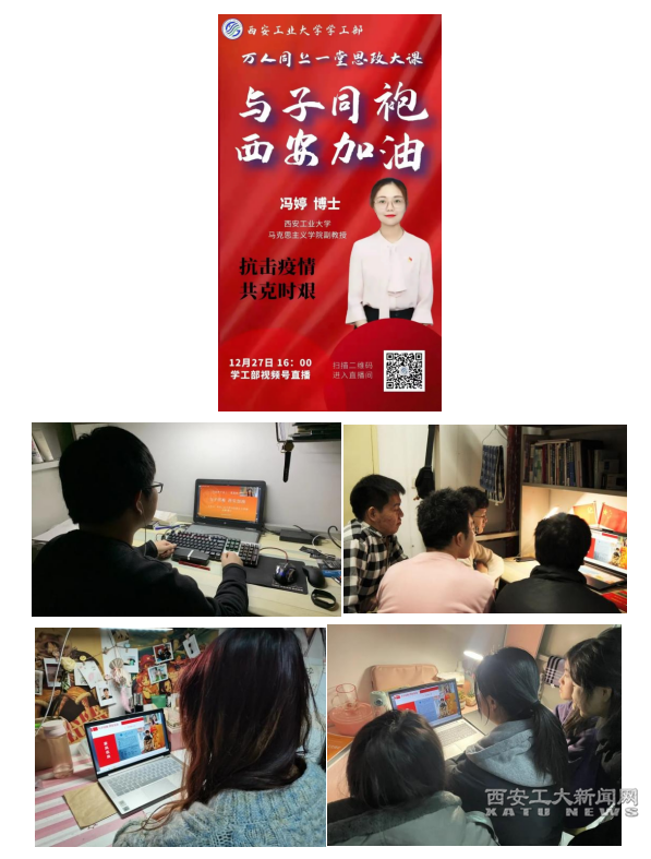 馬克思主義學院教師馮婷,在線為全體西工學子共上《與子同袍 西安加油》思政課。從“家是最小國”,“國是千萬家”,深入講解家國情懷的時代內涵,要求同學們擔起新時代賦予的歷史責任,在當前疫情防控的緊急時刻,不負使命、砥礪前行,用奮斗者最美的姿態,去沖刺人生的百米賽,書寫無愧于時代的壯麗篇章。