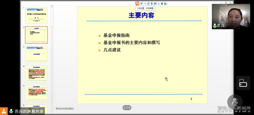 講座通過視頻會議的方式進行,科技工作部、文科學院的61名教師參加了講座,整場講座持續了一個半小時。蘇兵教授的講座深入淺出、邏輯性強,對有意申報教育部人文社科項目的老師們具有很強的啟發性和指導性。