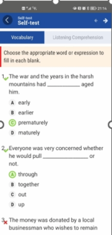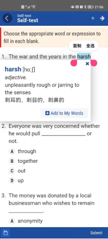 通過Welearn平臺,每個單元移動端獨享的詞匯練習和“四級題型測試(self-test)”,有查詞、有答案,抑制了學生的畏難情緒,促使他們實現(xiàn)了課后自主練習,還可以感受隨時提交、即時反饋的體驗。