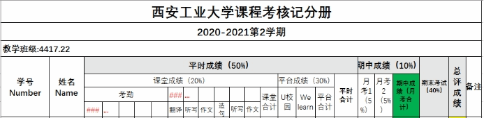 過程性評價成績=課堂成績×20%+Fif月考1×5%+Fif月考2×5%+U校園×20%+Welearn×10%